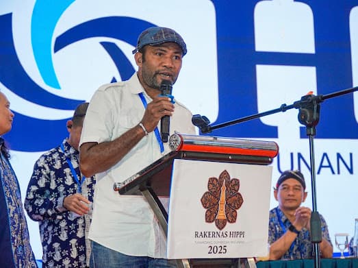 Ketua DPD HIPPI Papua Barat Jemmy Morin saat memberikan sambutan dalam rakernas HIPPI di Yogyakarta pada Rabu (12/11/2025). (FOTO//IST)