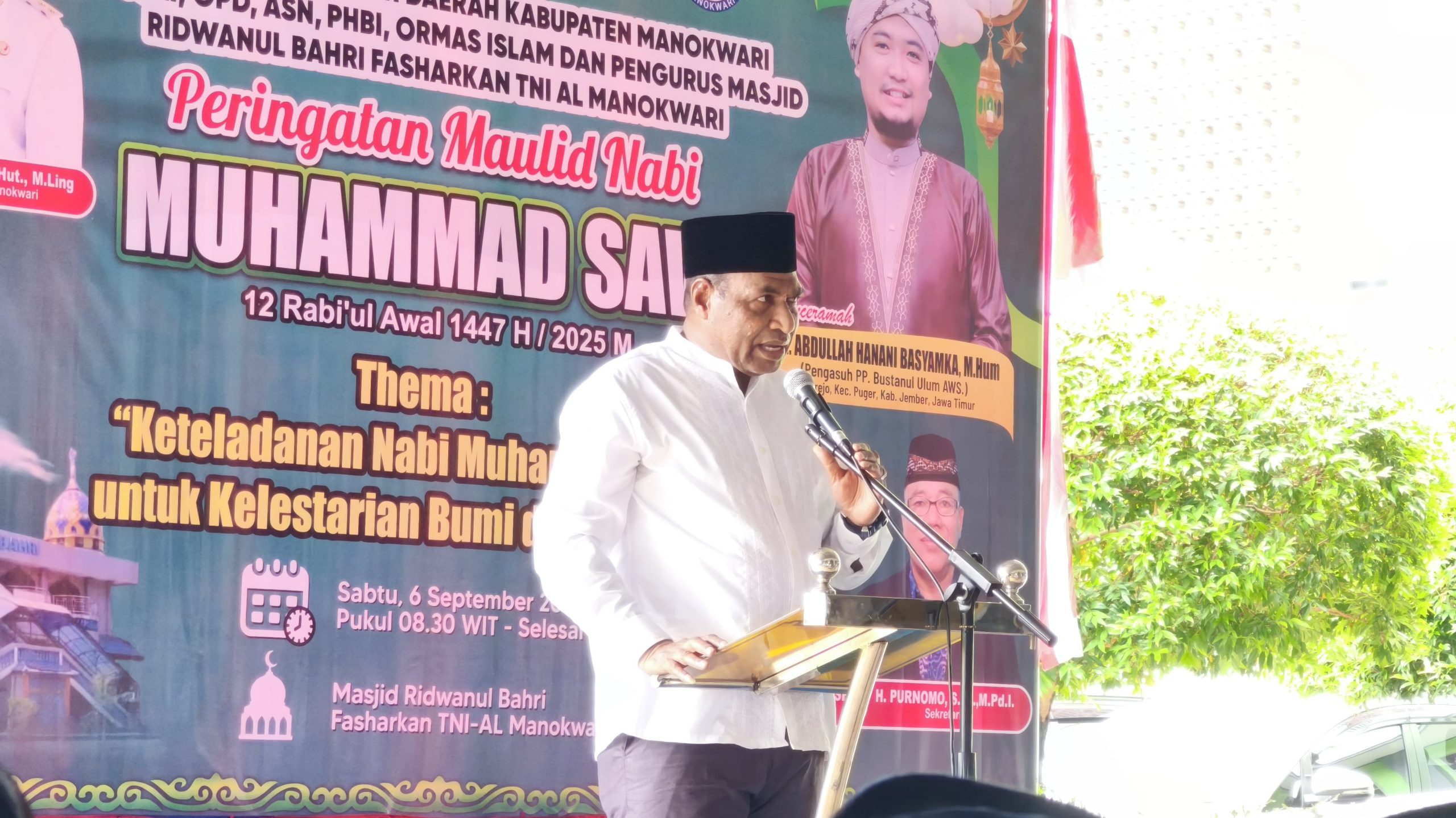 KAMUNDANFM.COM, MANOKWARI – Wakil Gubernur (Wagub)Papua Barat, Mohamad Lakotani, menghadiri Peringatan Maulid Nabi Muhammad Saw yang digelar di Masjid Ridwanul Bahri, Fasharkan TNI AL, Manokwari, Sabtu (6/9/2025).