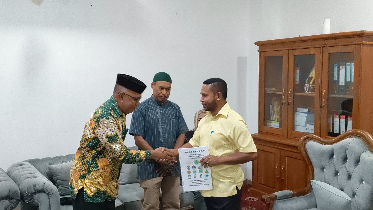 Ketua MUI Kabupaten Fakfak, Mohamadon Daeng Husein saat menyerakan kajian penolakan peredaran miras di Kota Pala ke DPRK Fakfak, Jumat (31/10/2025). (FOTO//ARA)