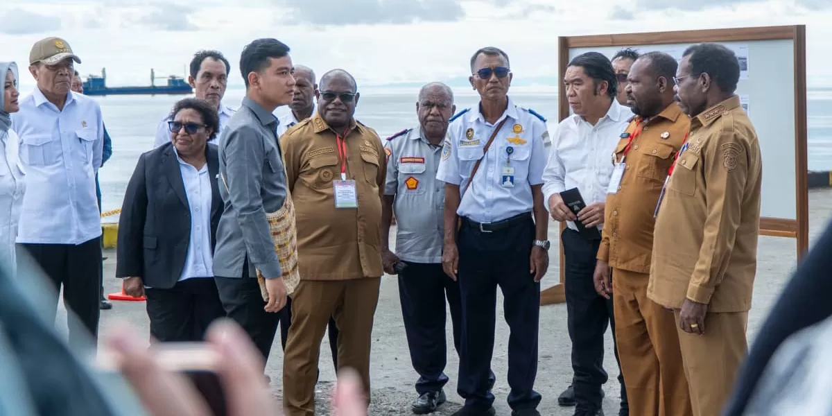 Wakil Presiden Gibran bersana Menteri Koordinator Bidang Politik dan Keamanan Djamari Chaniago, Wakil Menteri Dalam Negeri Ribka Haluk, Kepala Badan Pengarah Percepatan Pembangunan Otonomi Khusus Papua (BP3OKP) Papua Tengah Petrus Waine, serta Bupati Nabire Di Pelabuhan , Samabusa , Nabire  ( Dok.foto Kamundanfm.com )